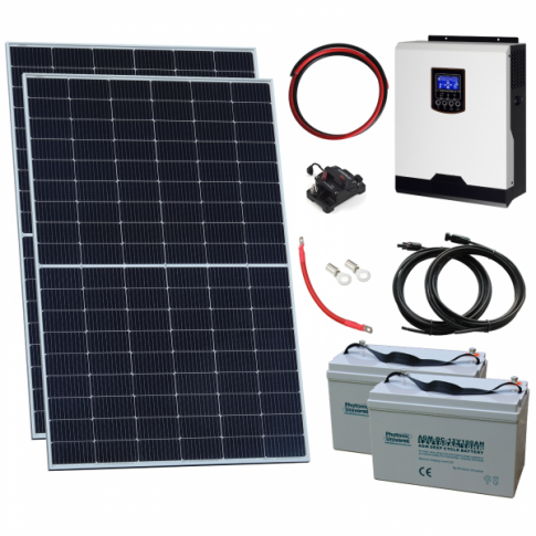 Includes 2 x 410W Sharp monocrystalline solar panels, a 3000W 24V hybrid inverter with integrated 40A MPPT solar charge controller and 25A mains battery charger, 2 x 100Ah AGM batteries and connection cables